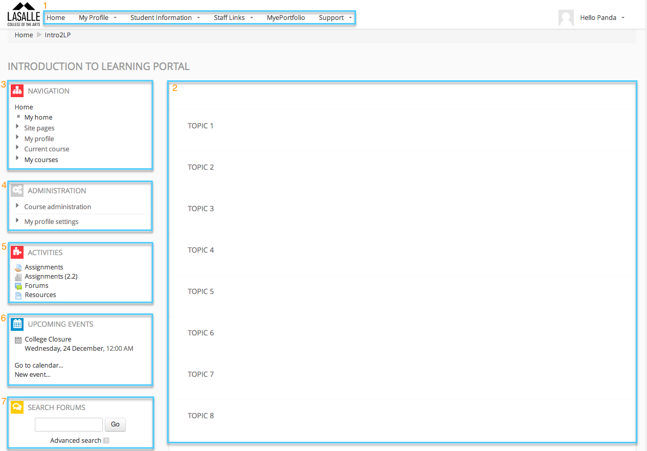 Navigation & Getting Around 1. The top menu bar contains links to Learning Portal homepage, My Profile, Student Information, Staff Links, MyePortfolio, and Support page.